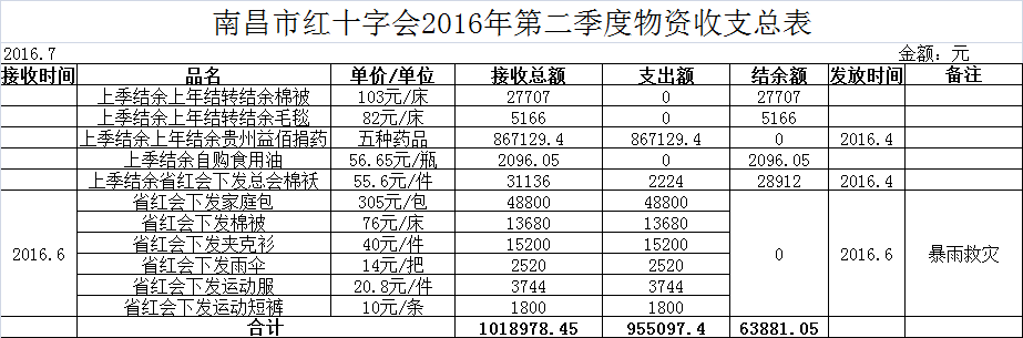 南昌市红十字会2016年第二季度物资收支总表
