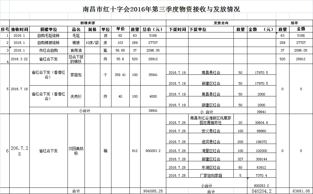 南昌市红十字会2016年第三季度物资接收与发放情况