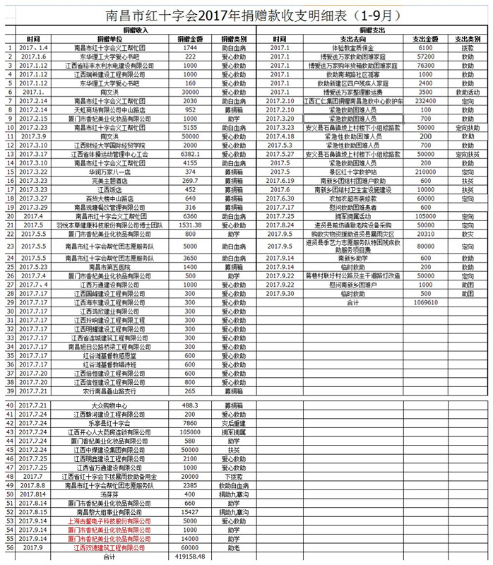 南昌市红十字会2017年捐赠款收支明细表(1-9月)