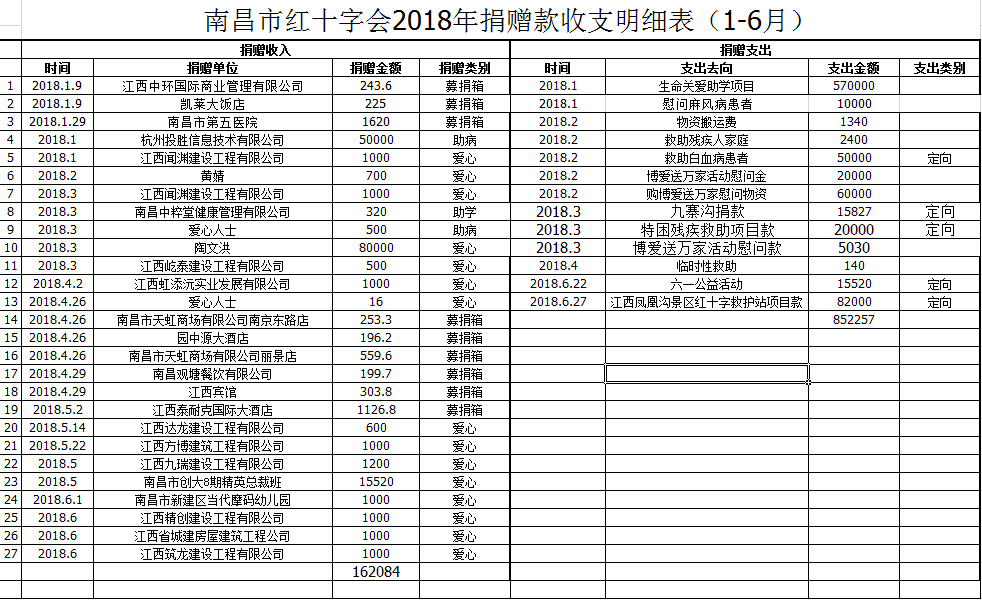 南昌市红十字会2018年捐赠款收支明细表(1-6月)