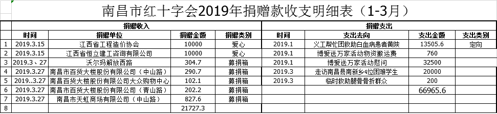 南昌市红十字会2019年捐赠款收支明细表(1-3月)