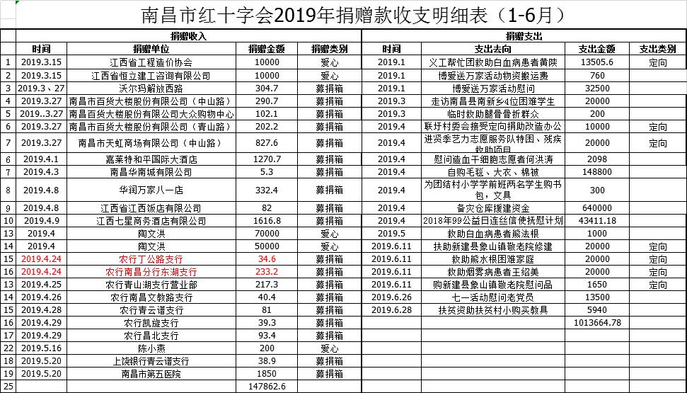 南昌市红十字会2019年捐赠款收支明细表(1-6月)