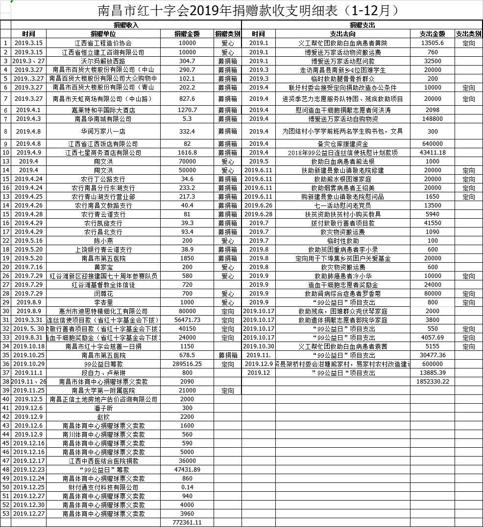 南昌市红十字会2019年捐赠款收支明细表(1-12月)