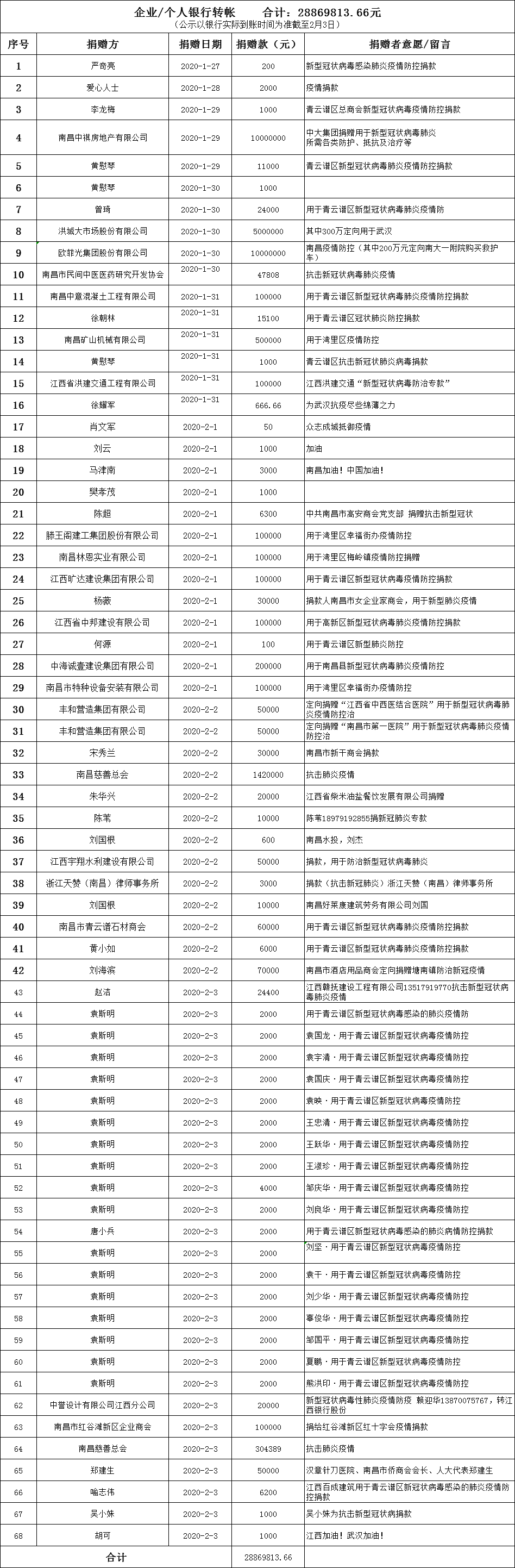 1、从2020年1月24日起至新型冠状病毒肺炎疫情防治工作结束,我会接收的所有捐款捐物定向用于南昌市疫情防控工作,由市疫情防控应急指挥部统筹。