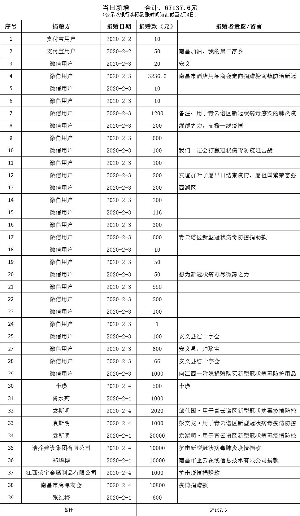 1、从2020年1月24日起至新型冠状病毒肺炎疫情防治工作结束,我会接收的所有捐款捐物定向用于南昌市疫情防控工作,由市疫情防控应急指挥部统筹。
