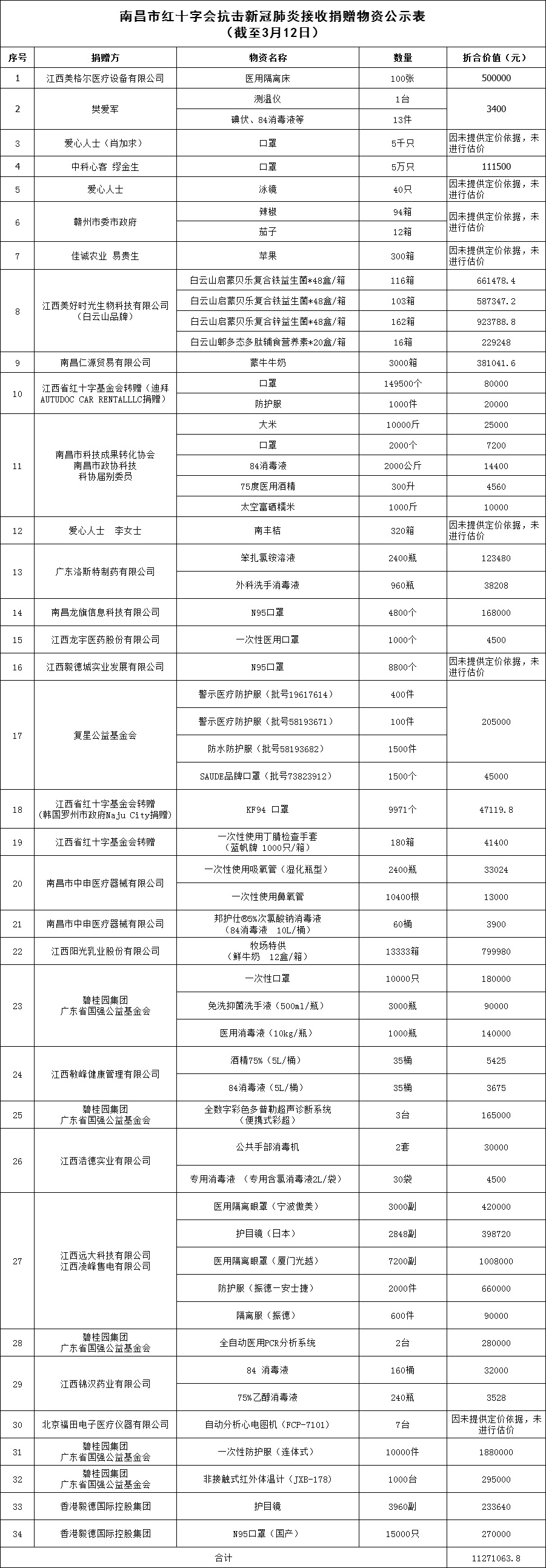 捐物折合人民币11271063.8元