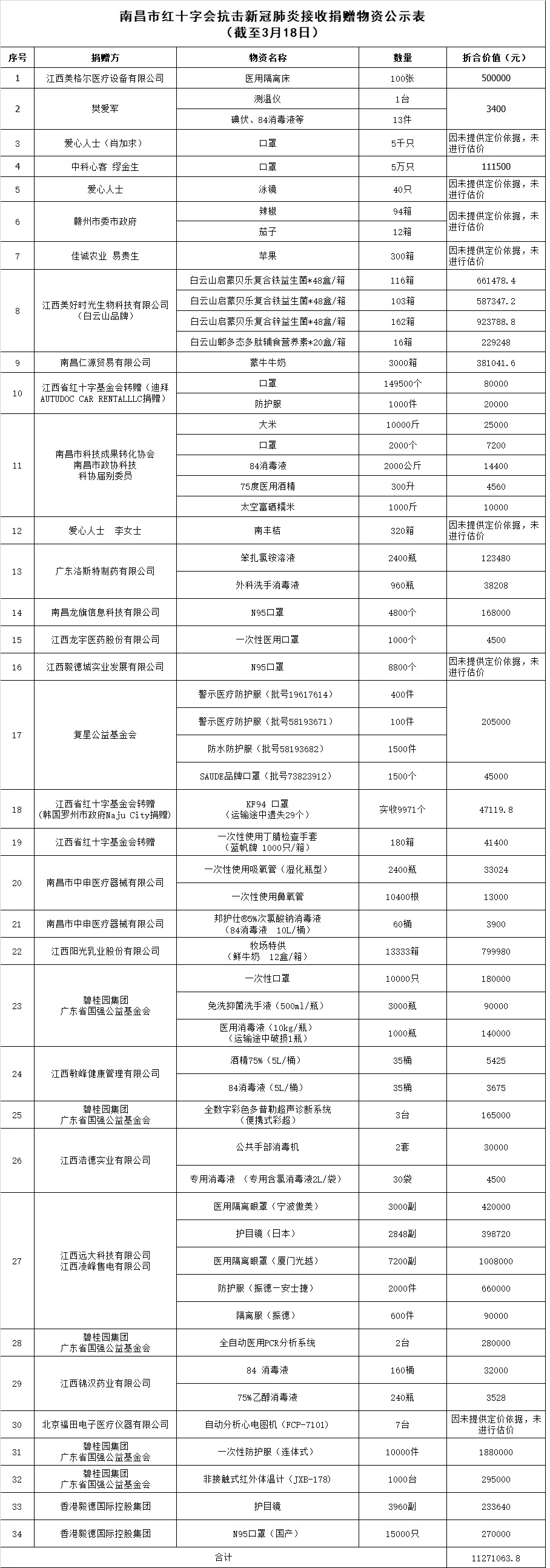 捐物折合人民币11271063.8元