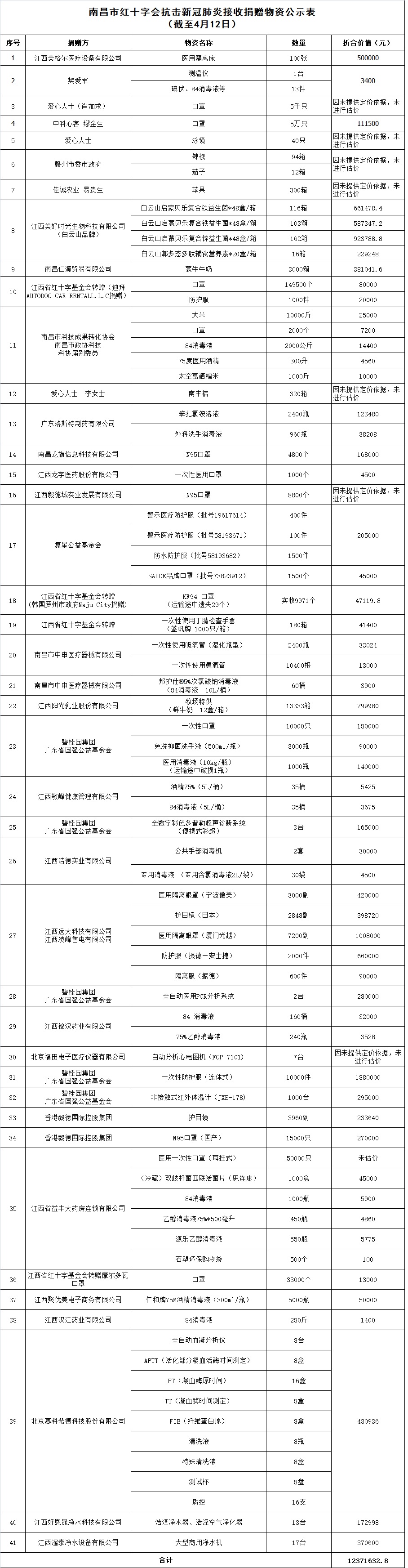 捐物折合人民币12371632.8元