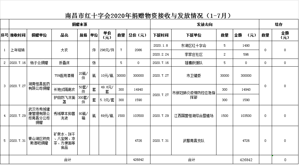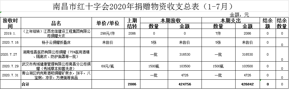 南昌市红十字会2020年1-7月捐赠物资收支情况公示