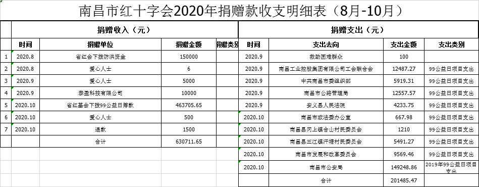 南昌市红十字会2020年捐赠款收支情况公示(8-10月)