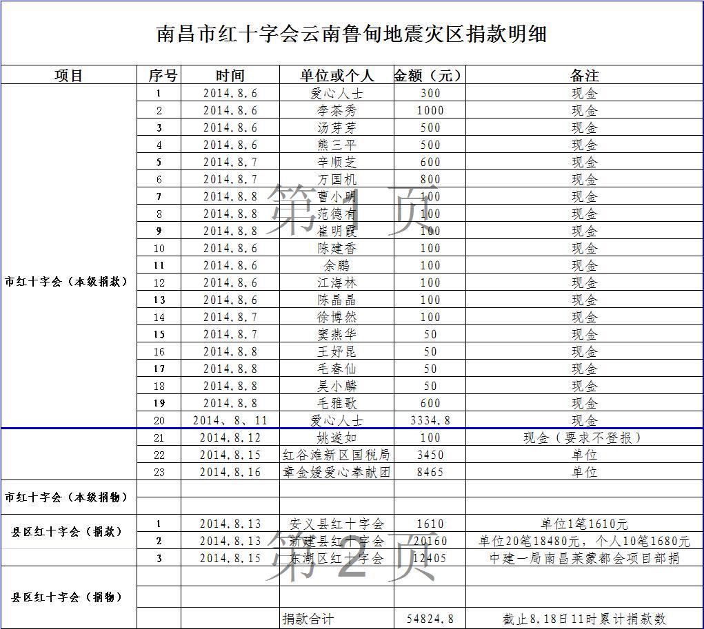 (截止8月18日)南昌市红十字会云南鲁甸地震灾区捐款明细