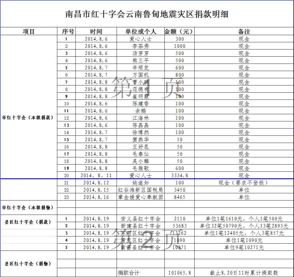 (截止8月20日)南昌市红十字会云南鲁甸地震灾区捐款明细