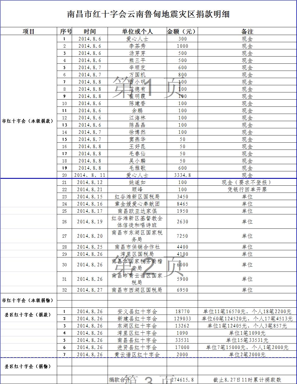 (截止8月27日)南昌市红十字会云南鲁甸地震灾区捐款明细