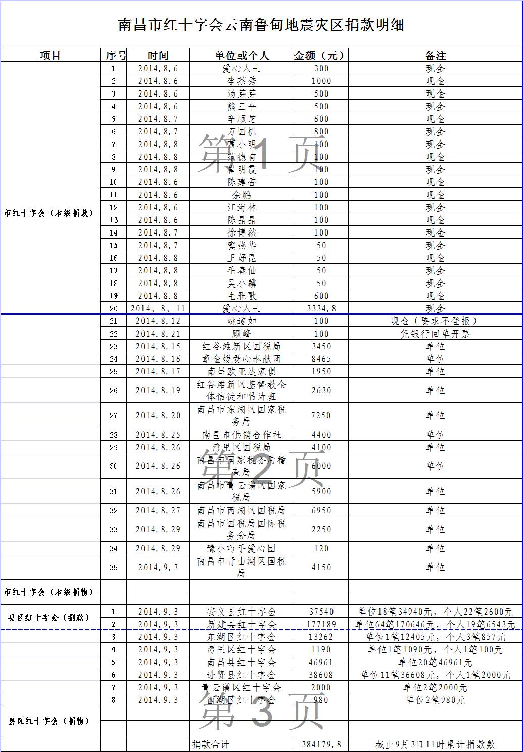 (截止9月3日)南昌市红十字会云南鲁甸地震灾区捐款明细