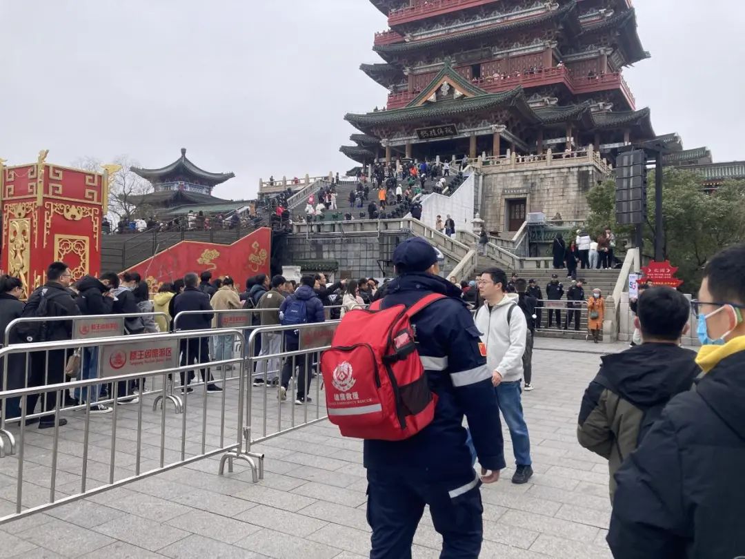 在滕王阁景区,市红十字雄鹰救援队联动红十字景区救护站开展应急救护服务,他们携带急救包、移动AED等应急救援装备,在景区开展巡逻,为广大群众提供应急救护、突发事件处理等服务,确保群众有需要时红十字”救“在身边。