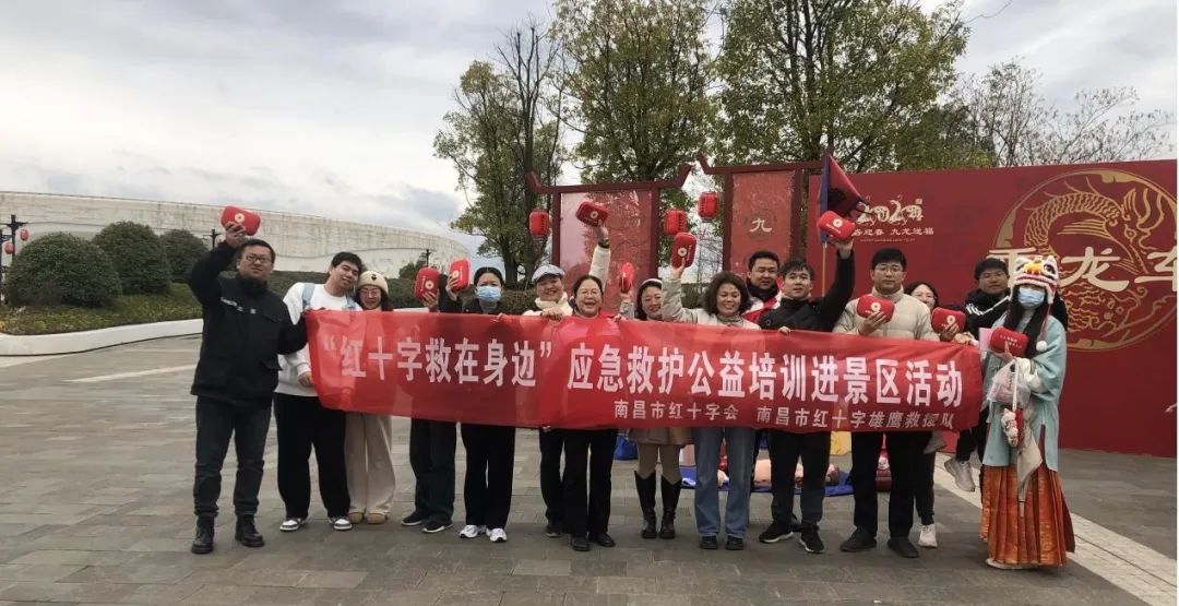在汉代海昏侯国遗址国家考古遗址公园,市红十字雄鹰救援队和新建区红十字会分别多次依托红十字景区救护站开展应急救护志愿服务活动,志愿者们携带急救包、模拟人,通过与游客开展互动游戏、实操展示、发放宣传册等形式,向他们普及应急救护、红十字运动等知识和技能,增强他们的安全防范意识,提高他们的自救互救能力。