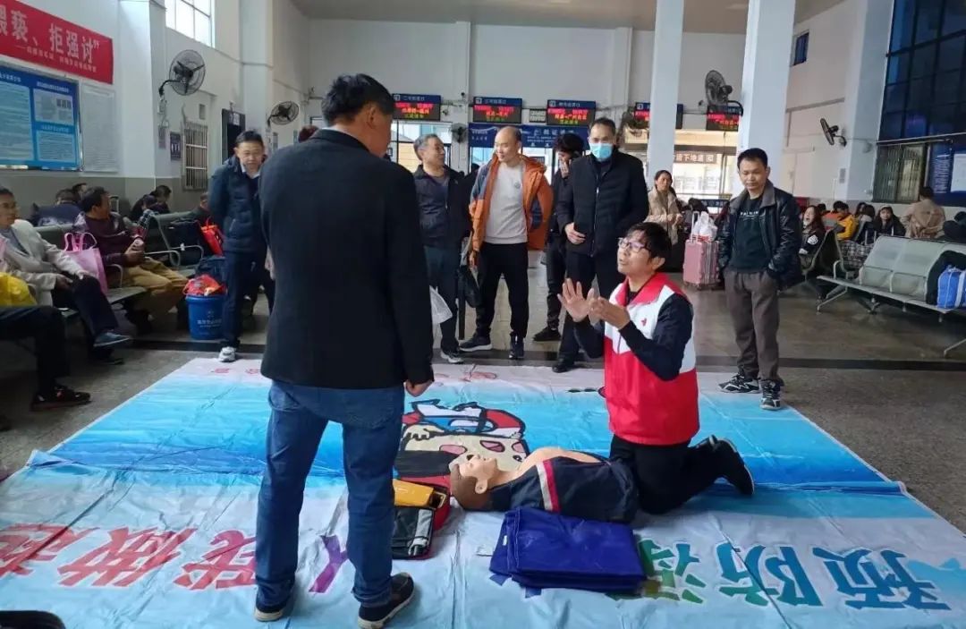 在安义县公交枢纽车站,安义县红十字会组织南丁格尔志愿服务队志愿者对正在候车的旅客开展AED使用和心肺复苏演示,提高旅客应急救护知识,为广大旅客春运出行安全护航。
