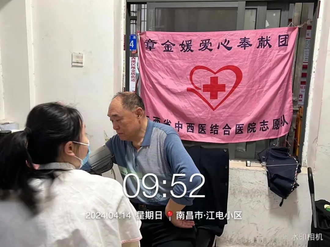 4月14日,中西医结合医院小组志愿者在西湖区上窑湾社区开展健康义诊、科普讲座、入户探访等志愿服务。