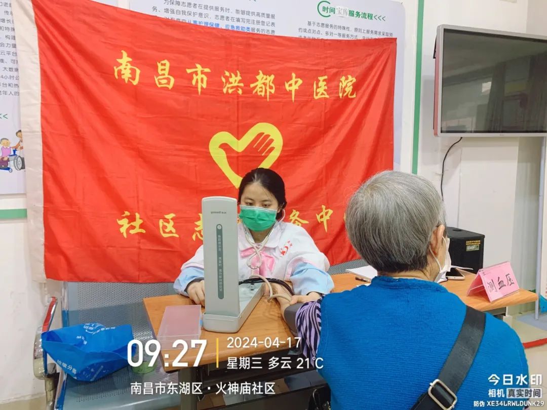 4月17日,市洪都中医院小组志愿者在东湖区火神庙社区开展社区义诊、健康指导等志愿服务活动。