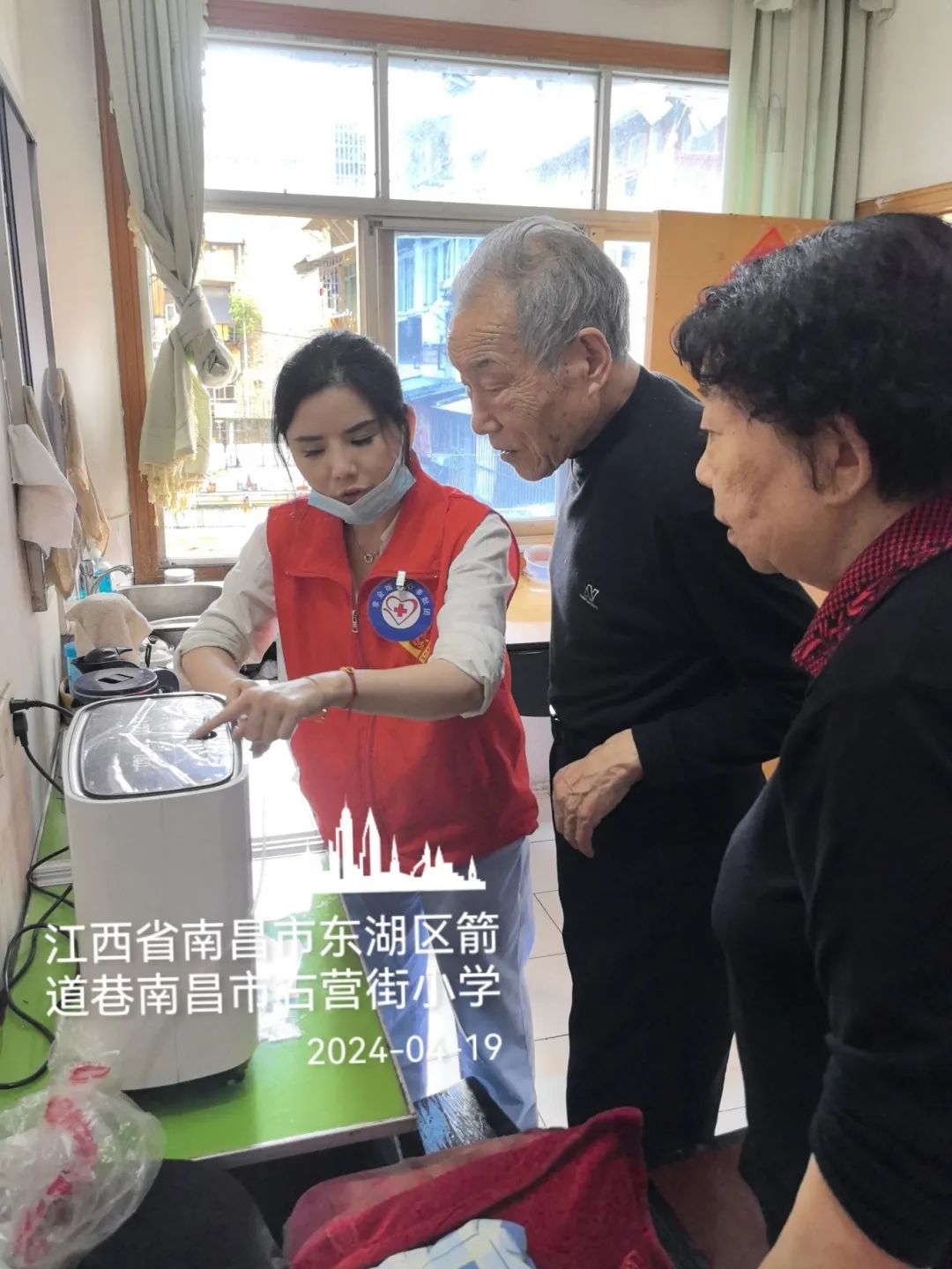4月19日,省胸科医院小组志愿者在东湖区马家池社区开展入户探访、家庭用氧指导等志愿服务。