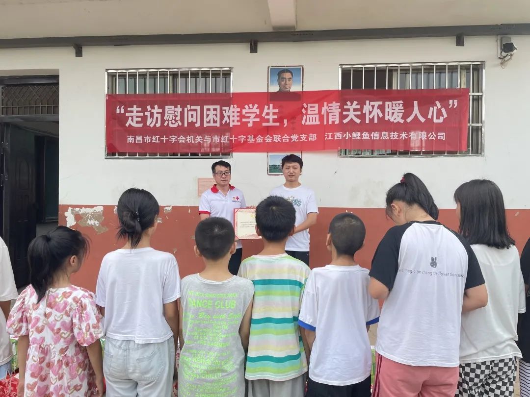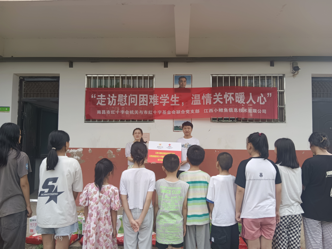 7月15日上午,南昌市红十字会机关与市红十字基金会联合党支部联合江西小鲤鱼信息技术有限公司开展“走访慰问困难学生,温情关怀暖人心”捐赠活动。江西小鲤鱼信息技术有限公司总经理王振、南昌市红十字会机关党支部专职副书记江海林、南昌经开区樵舍镇社会治理办主任胡田青参加捐赠活动。